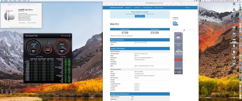 A l’arrivée, ça marche très bien, j’ai une belle machine triple boot : Mojave, Windows 10 et Ubuntu 18. Au niveau des performances c’est l’équivalent d’un iMac Pro 8 coeurs – ma machine est 20% plus puissante en simple cœur et en GPU (j’ai installé un Sapphire Radeon RX Vega56 pulse 8G° comme installée par Apple, mais celle d’Apple est bridée car sans cela elle chaufferai trop dans le boitier exiguë de l’Imac) et 8% moins puissante en multicœurs. Tout fonctionne correctement sauf continuité car je n’ai pas installé de wifi. J’ai un clavier et un trackpad Apple qui se connectent en usb/lightning ou en bluetooth. Il faut qu’ils puissent se connecter par câbles pour windows et ubuntu ainsi que pour clover qui gère le bios et le choix du système au démarrage. J’ai deux SSD NVMe de 512G° chacun qui ont des performances similaires aux SSD très rapides d’Apple, 4 disques dur de 4T° chacun et un superdrive.