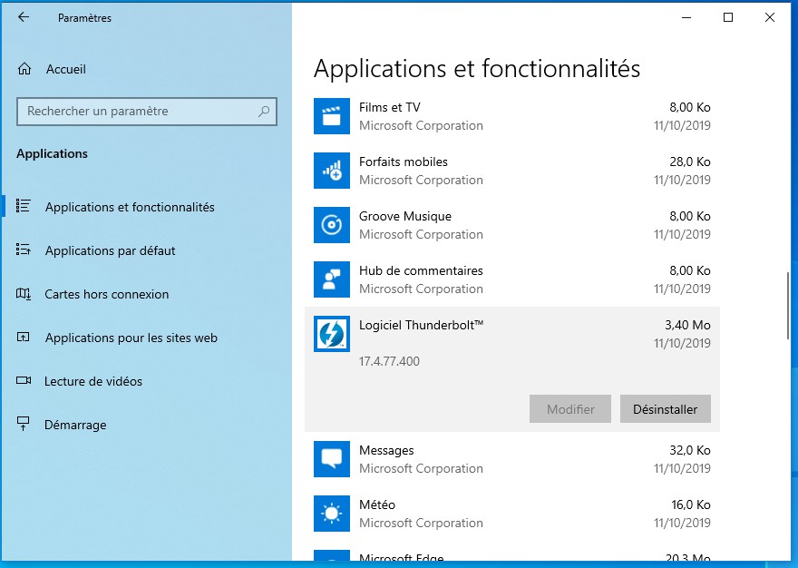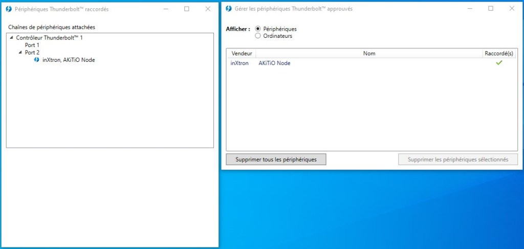 Sous Windows, lorsque le câble Thunderbolt est connecté, l’OS le signale et il faut alors approuver la connexion (une seule fois suffit, ensuite, selon les choix le périphérique connecté sera immédiatement reconnu sous Windows. Dans mon cas, un boitier eGPU Akitio Node).